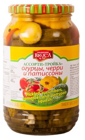Zloženie: voda, okurky, paradajky, dýňe, cukr, soľ, feferonka, kopr, listy křenu, cesnak, celer, bobkový list, pepř, okyselovač kyselina citrónová a octová.