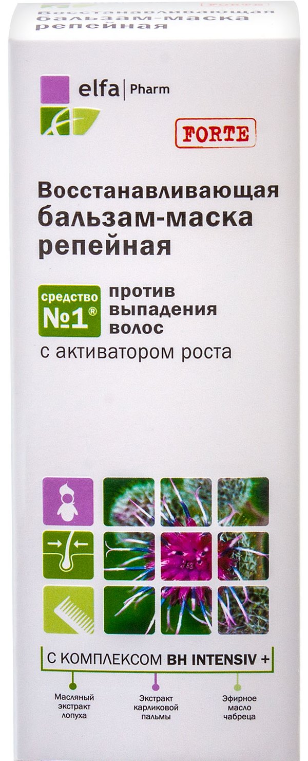 Regenerační balzámová maska ​​Elfa Farm Burdock s komplexem Bh intensiv + a aktivátorem růstu dodává vlasům vitalitu, hloubkově je zvlhčuje a usnadňuje rozčesávání. Doporučeno pro použití v kombinaci s šamponem Lopuch ze stejné série. Stejně jako ostatní produkty ze série Lopuch z farmy Elfa obsahuje regenerační balzámová maska ​​jako jednu z hlavních účinných látek přírodní lopuchový olej, který se získává z kořenů lopuchu velkého (Arctium Lappa). Tento olej je známý svým bohatým složením a vysokou účinností v boji proti vypadávání vlasů. Regenerační balzámová maska ​​z lopuchu obsahuje aktivní komplex Bh intensiv +, který stimuluje prokrvení pokožky hlavy a zlepšuje výživu vlasových kořínků, aktivuje a prodlužuje fázi růstu vlasů, stimuluje syntézu keratinu, obnovuje strukturu vlasů po poškození, a také směřuje prospěšné bílkoviny hluboko do vlasů (do kůry).