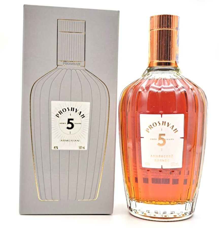 Brandy 5 rokov 0,5L 40% PROSHYAN sa vyrába podľa tradičnej metódy výroby koňaku z hroznového vína odrody Kangun pestovaného na viniciach v Arménii. Vyvážený brandy jantárovej farby s ľahkými odtieňmi mahagónu má čokoládovo-drevenú chuť a vôňu. Vyniká svojou plnosťou, jemnosťou a dlhotrvajúcou chuťou. Doba zrenia brandy v dubových sudoch je minimálne 5 rokov. Odporúča sa podávať pri izbovej teplote.