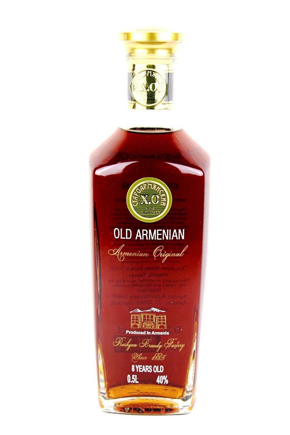 Starý Arménsky 8 rokov 0,5L 40% PROSHYAN sa vyrába z hroznového vína odrody Kangun pestovaného na viniciach v Arménsku. Vynikajúci brandy tmavšieho jantárového farby s výraznými tónmi vanilky a čokolády vyniká svojou plnosťou, jemnosťou a dlhotrvajúcou chuťou. Doba zrenia brandy v dubových sudoch je minimálne 8 rokov. Odporúča sa podávať pri izbovej teplote.