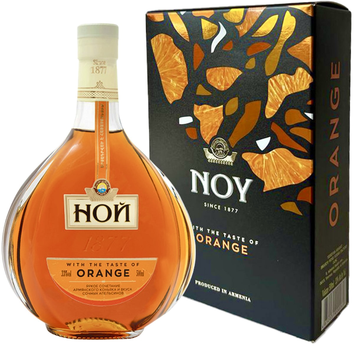 Brandy s příchutí pomeranče 33% 0,5L NOY je originální nápoj s obsahem alkoholu 33%, představující jasné spojení arménského koňaku a chuti zralých pomerančů. Tento nápoj sa odporúča podávať ako digestív, s ľadom ako aperitív alebo ako súčasť kokteilov. Brandy má zlatavú jantárovú farbu.