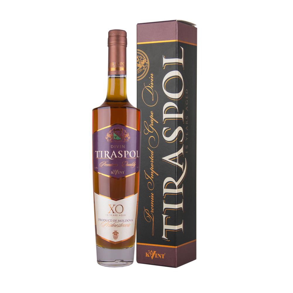 Brandy Tiraspol 15 let 0,5L 40% KVINT zraje v dubových sudech nejméně 15 let a je vyrobena z nejkvalitnějších konjaku. Tento brandy byl vytvořen k oslavě 100. výročí založení výrobního závodu KVINT, a proto je dodáván ve speciálním typu lahve. Tato brandy vyniká svou mimořádnou zralostí.
