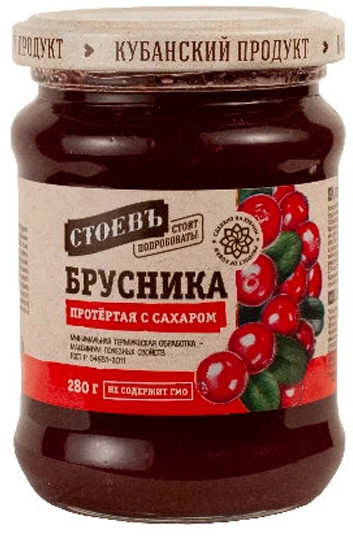 Pretretá brusnica s cukrom od značky „Stojev“ je prírodný produkt, pripravený zo zrelých bobúľ brusnice s prídavkom cukru. Má výraznú bobuľovú chuť a arómu, pričom zachováva všetky prospešné vlastnosti čerstvých bobúľ. Tento produkt je ideálny ako doplnok k čaju, na podávanie s palacinkami a lievanci, rovnako tak na použitie v domácej pečení a dezertných receptoch.
