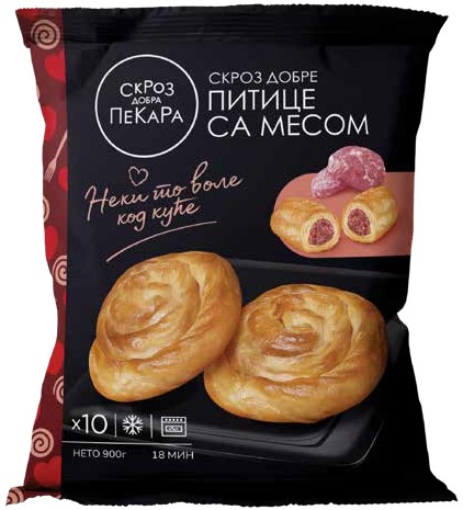 Zloženie: pšeničná múka T-400, voda, mäsová náplň 32 %, (voda, zemiaky na kocky, olej, sušená cibuľa, modifikovaný kukuričný škrob, prídavok do jedál so zeleninou, soľ) 57,55 %, cukor, sušená zelenina, ( 10,6 %), mrkva, paštrnák, cibuľa, zeler, čierne korenie mleté, palmový olej, slnečnicový olej, soľ, tekutý kvások, voda, pšeničná múka T-500, pšeničný kvások prášok, kyselina mliečna E 270, ječný draselný E 202, kyselina askorbová (E 300), cukor, zmes múky a ďalšie zložky na pečenie. pšeničný lepok, prostriedok na úpravu múky E 920.