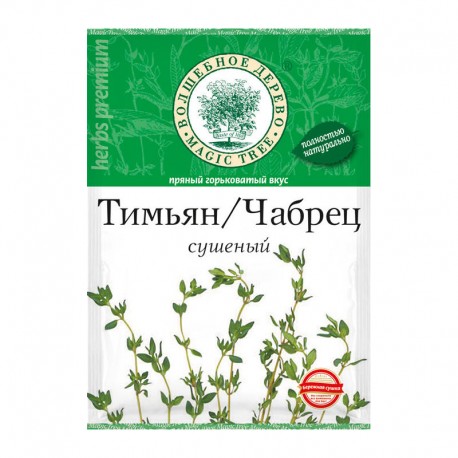Tymián (alebo čabréc) je aromatické korenie s teplou, mierne horkou chuťou a charakteristickou bylinkovou vôňou. Sušený tymián sa široko používa v kuchyni na dochutenie mäsových, rybích jedál, omáčok, polievok a príloh.