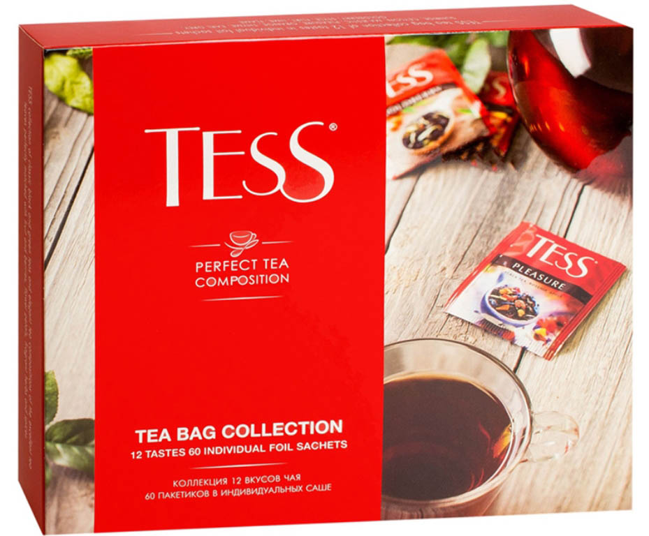 Zloženie: čierny baihový čaj Tess Sanraiz, čierny baihový čaj Tess Ceylon, čierny baihový čaj Tess Breakfast, čierny baihový čaj s arómou tropického ovocia a rastlinnými komponentami, čierny baihový čaj s arómou pomaranča a rastlinnými komponentami Tess Oranž, čierny baihový čaj s arómou citróna a tymiánu a rastlinnými komponentami Tess Time, čierny baihový čaj s arómou bergamotu a rastlinnými komponentami Tess Earl Grey, čierny baihový čaj s arómou rakytníka a hrušky a rastlinnými komponentami Tess Goldberry, zelený baihový čaj Tess Style, zelený baihový čaj s arómou bieleho broskyně a jahôd a rastlinnými komponentami Tess Flirt, čajový nápoj s chuťou a arómou jahôd s ružovým korením Tess Flame.
