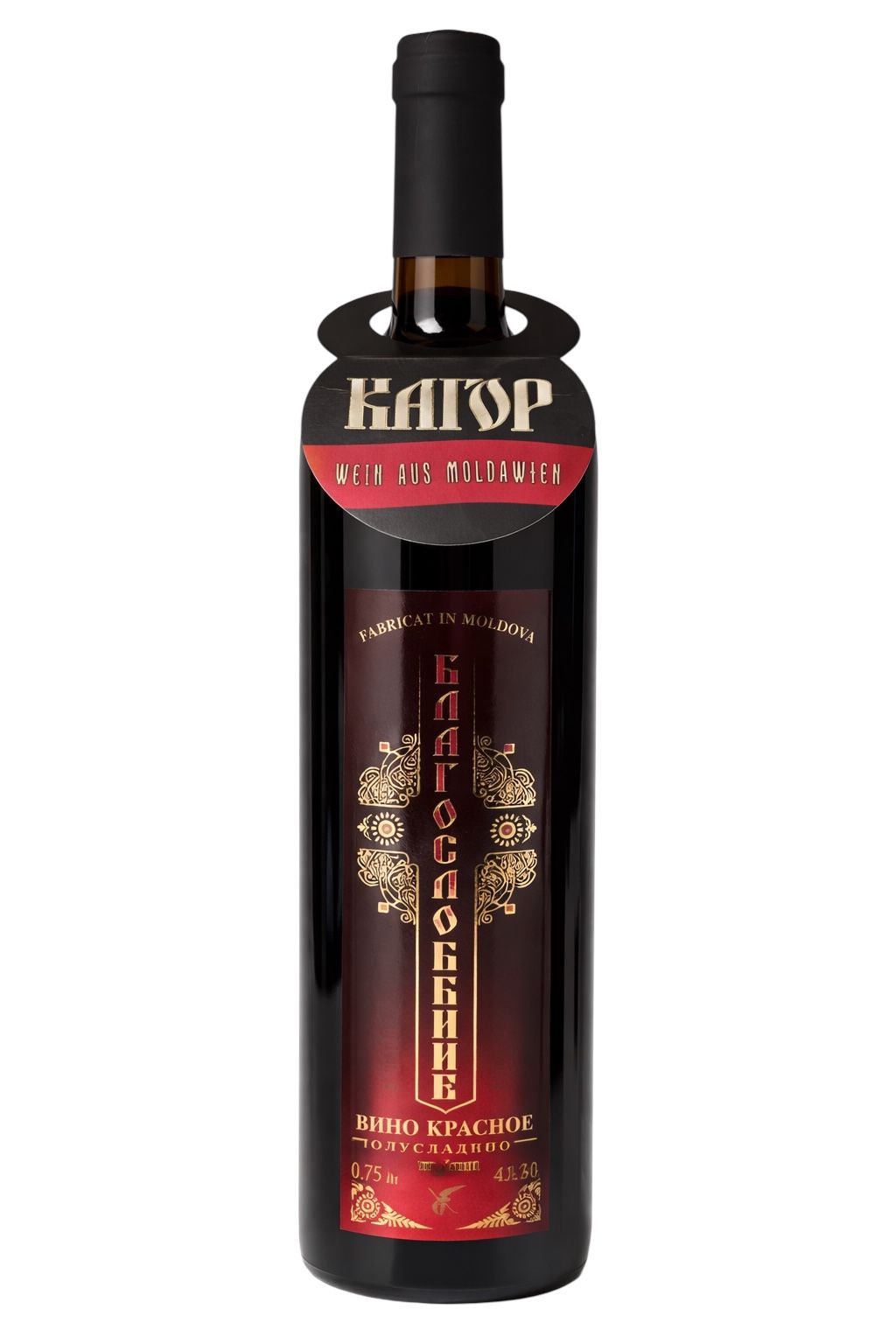 Červené polosladké víno Blagoslovenie 0,75 l — je vysoko kvalitné moldavské polosladké víno s hladkou, harmonickou chuťou a bohatým buketom aróm sliviek, čerešní a sušeného ovocia. Tmavo rubínová farba s tónmi zrenia. Víno sa výborne hodí k rôznym druhom syrov a ľahkým dezertom.