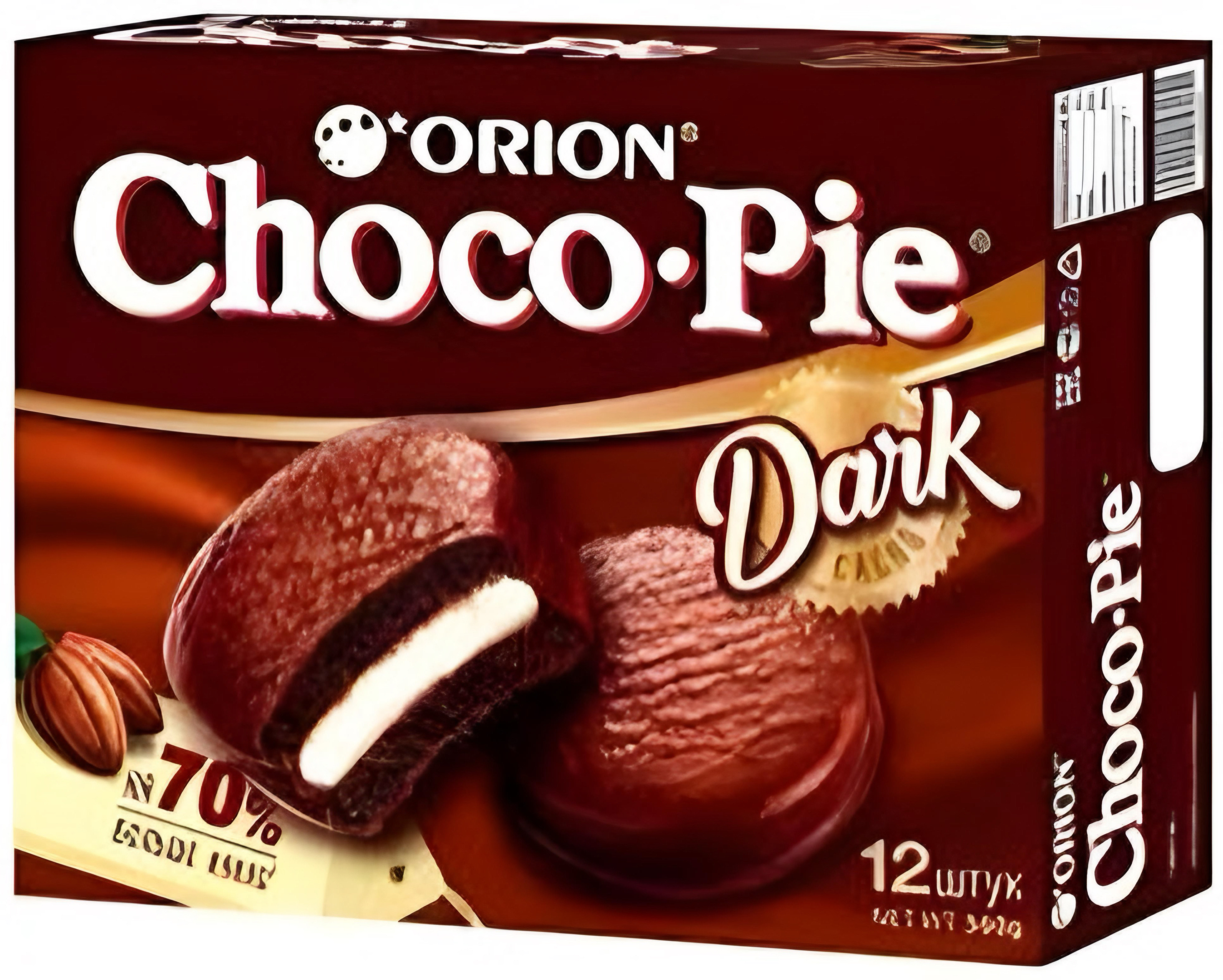 Orion Choco Pie Dark - trvajúci úspech Choco Pie Original od Orionu nás inšpiroval k vývoju nových receptúr, z ktorých jedna je Choco Pie Dark. Vzali sme kakaové bôby a náš tradičný recept, vložili sme do toho svoje srdce a dušu a vytvorili nový Choco Pie v tmavom formáte, v ktorom je o 70 % viac kakaových zŕn.