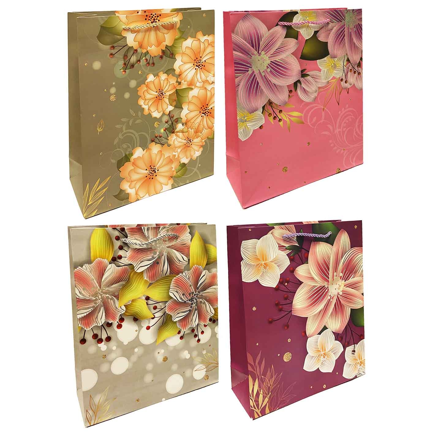 Darčeková taška veľkosti 26×32 cm, vyrobená z pevného a odolného materiálu, určená na balenie darčekov rôznych veľkostí a typov. Ozdobená farebným kvetinovým motívom, ktorý ju robí slávnostnou a univerzálnou pre rôzne príležitosti.