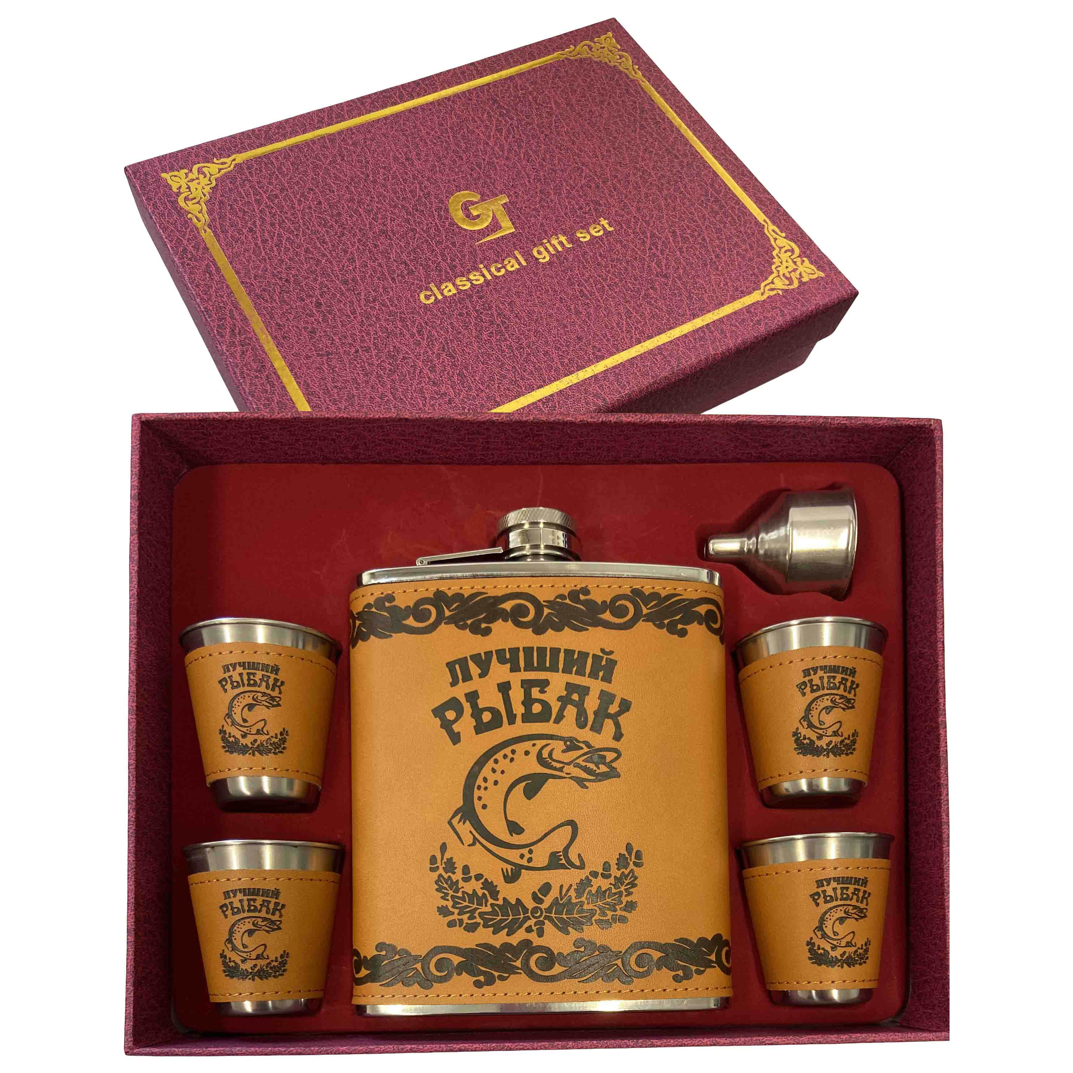 Pánska darčeková sada "Luchshij rybak" je sada, ktorá obsahuje: 4 hromádky, nerezovú ploskačku a lievik.