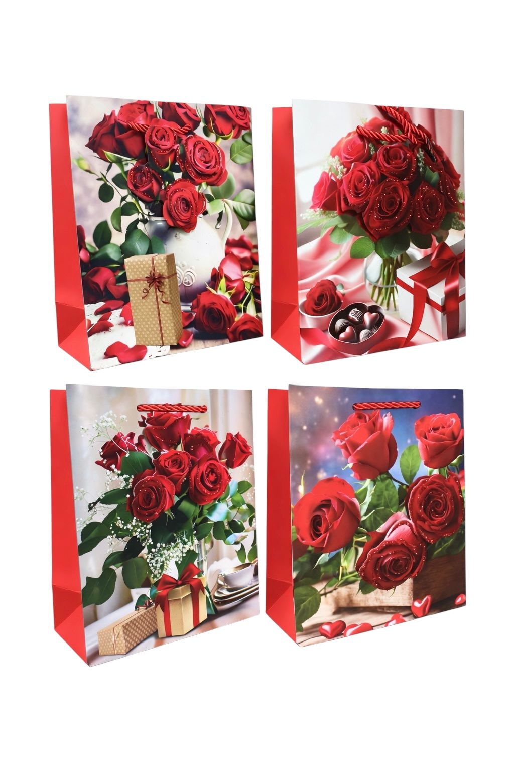 Darčeková taška s rozmermi 23×18 cm, vyrobená z pevného a odolného materiálu, určená na balenie menších darčekov a suvenírov. Ozdobená jemnou a slávnostnou potlačou s motívom ruží a darčeka, ktorá dodáva baleniu elegantný a slávnostný vzhľad.