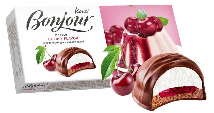 Zloženie: cukor, pšeničná múka prvotriednej kvality, sirup z kukuričného škrobu, cukrársky tuk, kakaový prášok, rafinovaný palmový olej deodorizovaný, stabilizátor vlhkosti E 420, regulátory kyslosti (kyselina citrónová, citrát sodný, kyselina mliečna), emulgátory (sója lecitín, "Quick 96", E 476), vaječný bielok, sušená srvátka, arómy, koncentrovaná čerešňová šťava (0,2%), jedlá soľ, kypriace látky cesta (hydrogénuhličitan sodný, uhličitan a uhličitan "karmín", konzervant E 202.
