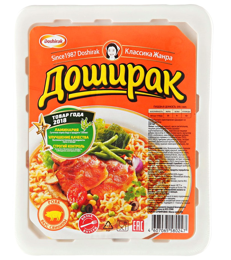 Zloženie: rezance (prémiová pšeničná múka, rastlinný olej, zahusťovadlo potravinárskych prísad (acetylovaný škrob), soľ, emulgátor potravinárskych prísad „K-300A“ (sójový olej, E322), lepok, komplexný stabilizátor potravinárskych prísad „pre1x“ E452i), sójový produkt (prášok zo sójovej omáčky, cukor, soľ, kvasnicový extrakt, vyprážaná cibuľa), sušená cibuľa, mliečna bielkovina, emulgátor E471), sójová omáčka, sezamový prášok, cesnak, bravčová príchuť, paprikový extrakt, čierne korenie), zosilňovač chuti a arómu Е621, maltodextrín, koreniaca sušená zelenina z kamabín výrobok sójový texturát), rybí výrobek sušené morské riasy (vločky).