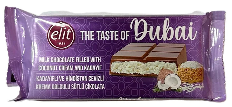 Dubajská čokoláda Elit (90 g) je prémiový produkt, ktorý spája vysoko kvalitné ingrediencie a jedinečnú chuť. Tento produkt je ideálny pre tých, ktorí ocenia skutočnú kvalitu a jedinečné sladkosti.