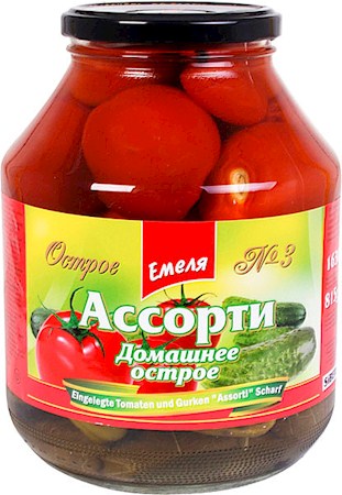 Zloženie: paradajky 36%, voda, uhorky 14%, cukor, soľ, feferónka 1%, regulátor kyslosti: kyselina octová, hroznový list, cesnak, čierne korenie, kôporový olej 0,0006%.