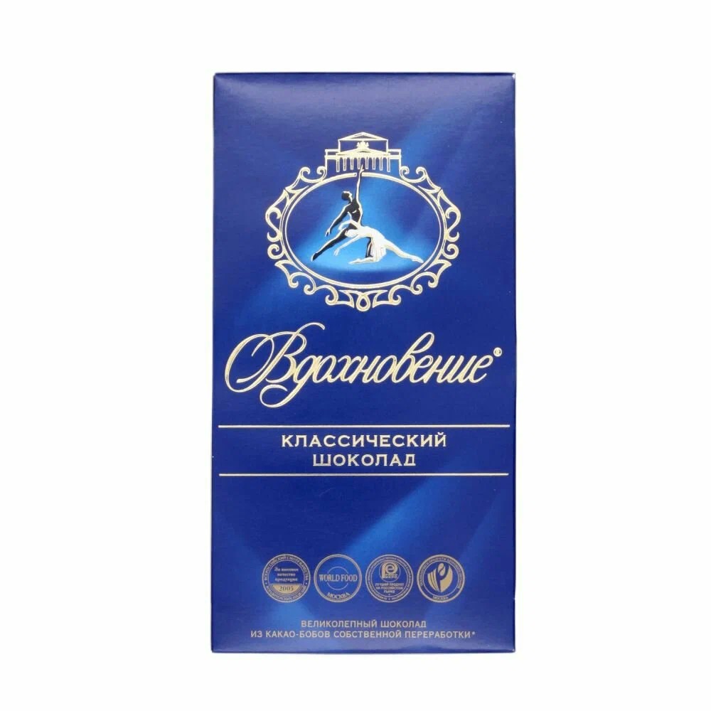 Horká čokoláda VDOKHNOVENIJE Klasická s drvenými jadrami pražených lieskových orechov sa vyrába podľa originálnej receptúry od roku 1976. Spája bohatú kakaovú chuť a ušľachtilú horkosť s jemnými tónmi pražených orechov. Jemne sa rozplývajúca textúra čokolády je zvýraznená rozptýlenými chrumkavými kúskami orechov. Vynikajúca dochuť a tradičný tvar tenkých tyčiniek v striebornej fólii už dlhé roky priťahujú znalcov všetkého krásneho a vyberaného.