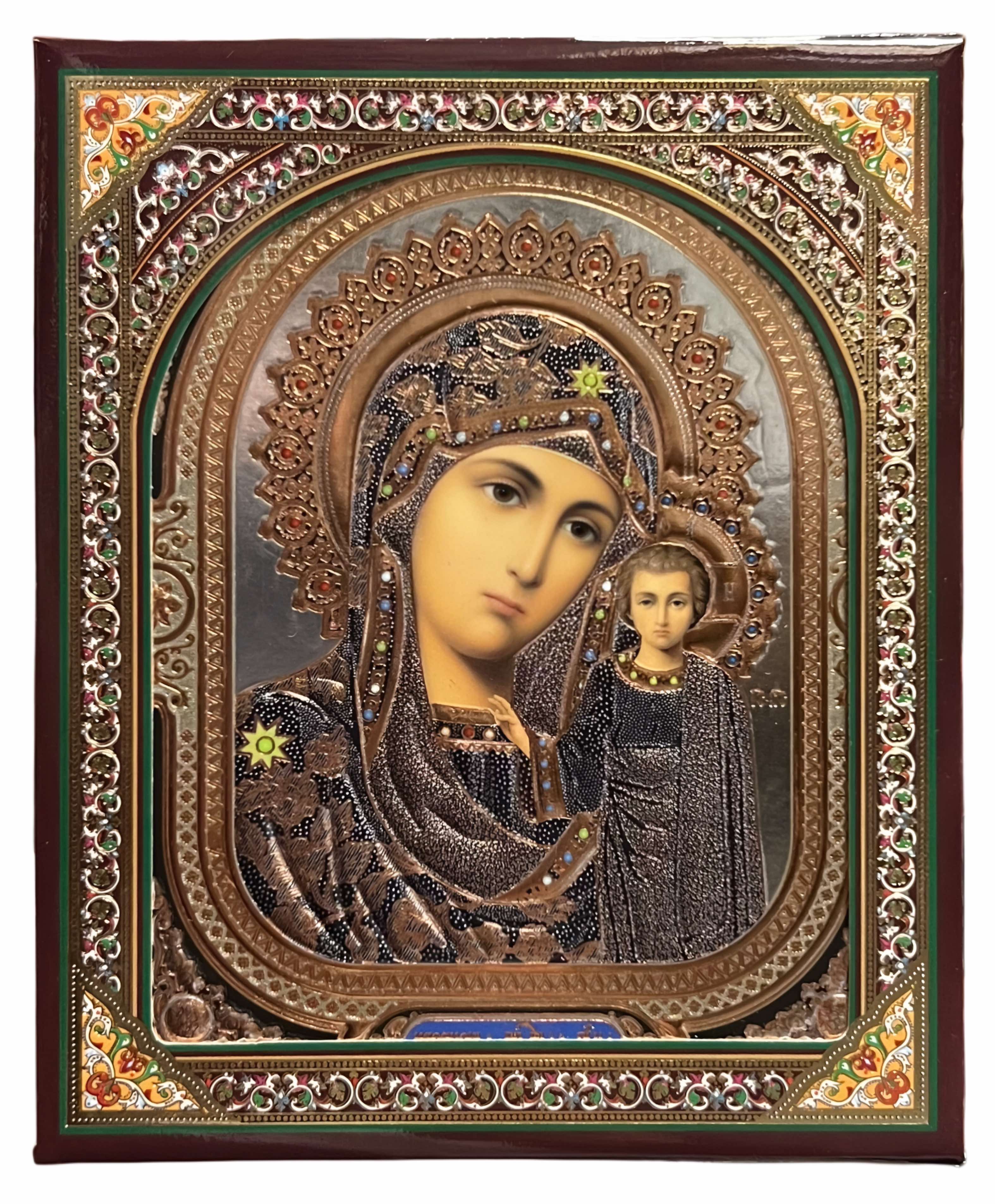 Ikona drevená Kazanská 10×12 cm v puzdre (strieborné pozadie)