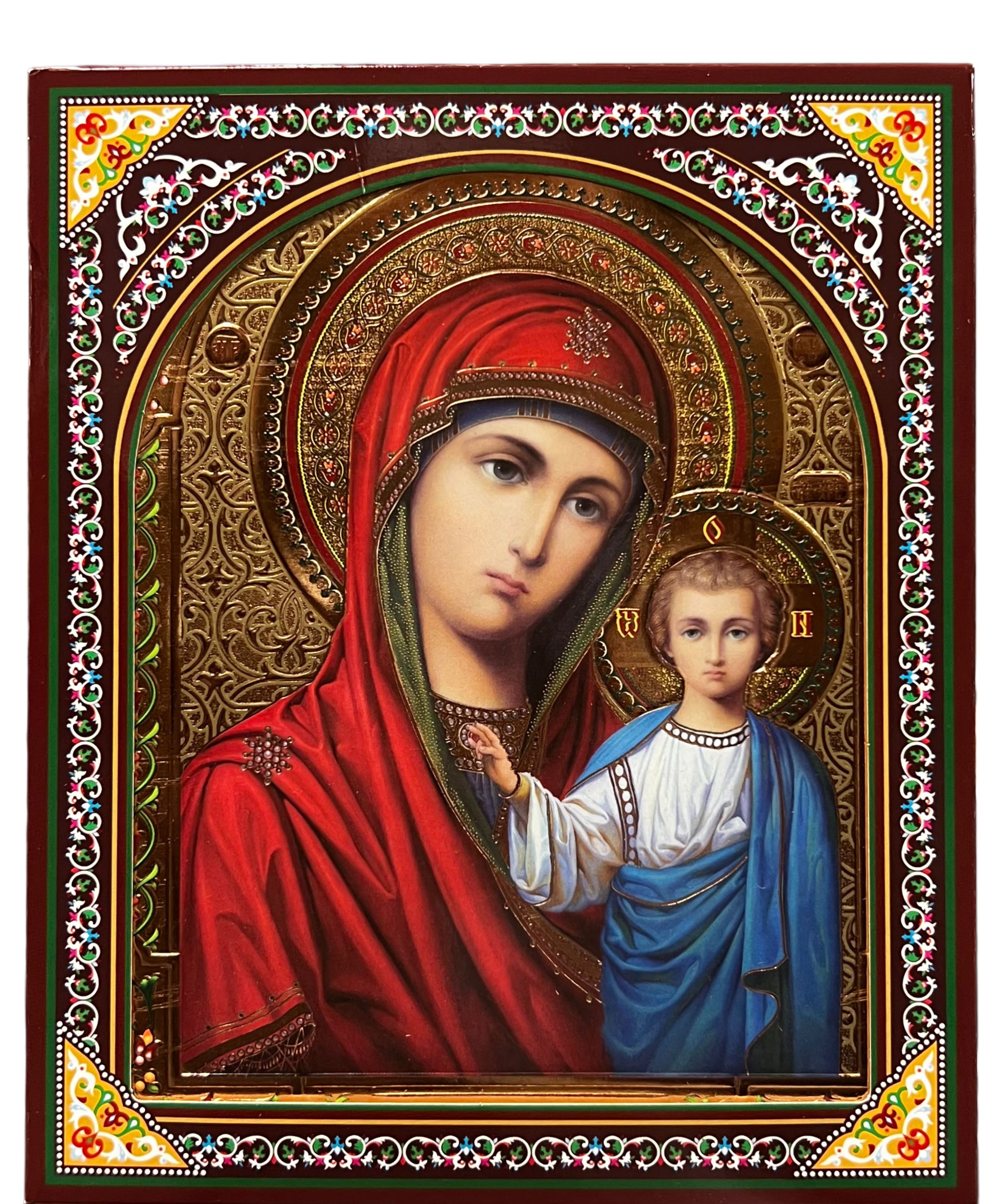 Ikona drevená Kazanská 15×18 cm v puzdre (červené šaty)