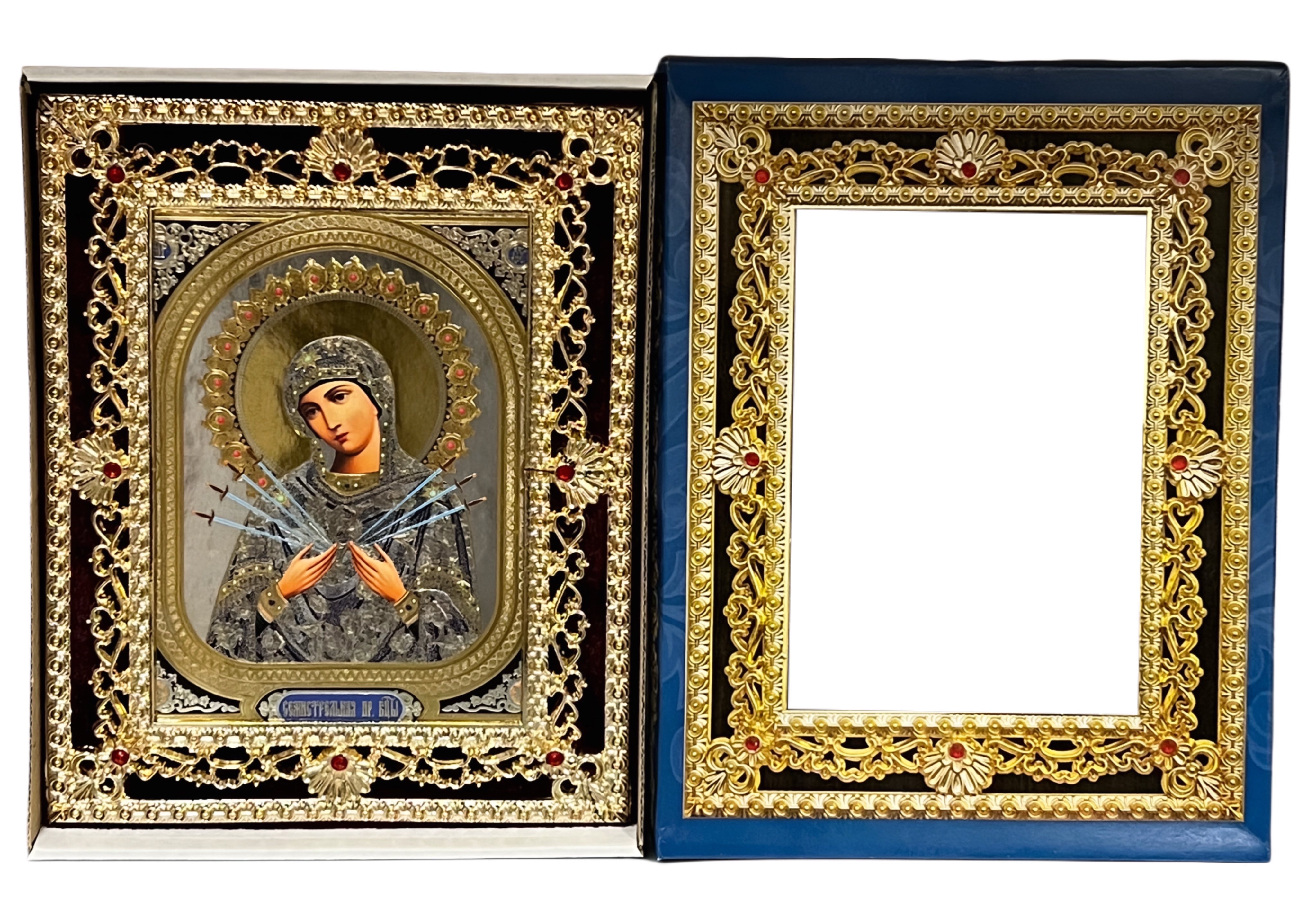 Ikona drevená Semistrelnaja 15×18 cm v modrom puzdre.