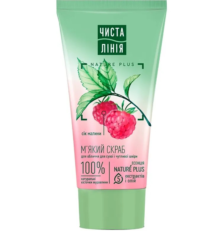 Produkt je vytvorený na základe esencie Nature Plus: 5 extraktov a olejov (extrakt z verbeny, pivoňky, mandľového oleja, ľanového oleja, olivového oleja). Aktívne prírodné zložky starajú sa, zjemňujú a tonizujú pokožku, poskytujú jemné čistenie. Bobule brusnice jemne odstraňujú odumreté bunky, aniž by poškodili citlivú pleť. Malinový džús ju upokojuje, predchádza vzniku začervenania a podráždenia, vyrovnáva tón pleti. Obsahuje 100% prírodných bobúľ brusnice a malinového džusu. Jemne čistí pleť, vyrovnáva jej farbu. Vytvorený pre suchú a citlivú pleť. Vyrobené bez testovania na zvieratách.