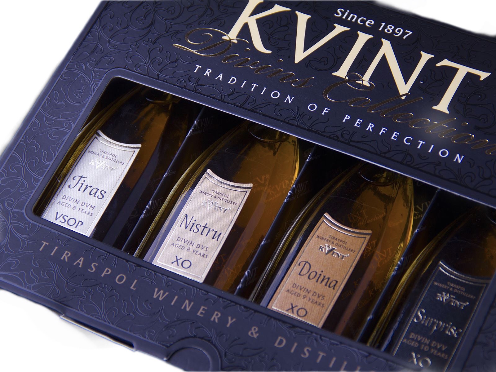 Kolekcia brandy 4x0,05L 40% KVINT zahŕňa 4 miniatúrne fľaše – Tiras (6 rokov), Nistru (8 rokov), Doina (9 rokov), Surprise (10 rokov). Vysokokvalitné brandy zreté v dubových sudoch ponúka vynikajúci nápoj zlatistej jantárovej farby s bohato rozvinutou arómou kvetov, vanilky a ovocia. Chuť brandy je mäkká a dlhotrvajúca.