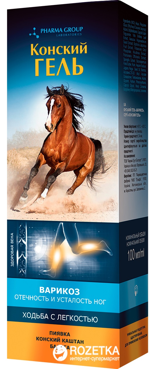 Konský gél "Varikoz" je špeciálne navrhnutý pre pokožku s príznakmi kŕčových žíl. Gél je optimálnou formou prípravku na pomocnú starostlivosť o pleť s prejavmi kŕčových žíl. Jeho ľahká a rýchlo sa vstrebávajúca konzistencia zaisťuje vysoký prienik účinných látok cez kožnú bariéru. Obsahuje aktívne zložky, ktoré pomáhajú zlepšiť stav pokožky s kŕčovými žilami. Pagaštan konský – zvyšuje mikrocirkuláciu v horných vrstvách pokožky, čím napomáha k zlepšeniu bunkovej výživy a obnove elasticity pokožky. Extrakt z pijavíc tonizuje pokožku, zmierňuje zápaly a opuchy, znižuje ochabnutosť pokožky, zlepšuje jej elasticitu. Badyaga aktivuje krvný obeh a metabolické procesy v koži, odstraňuje pocit ťažkosti a únavy v nohách. Listy červeného hrozna majú venotonický a antioxidačný účinok. Znížte opuchy, zvýšte tonus žilových stien, zabráňte vzniku kŕčových žíl. Rutín účinne posilňuje kapiláry, znižuje priepustnosť ciev a robí ich pružnejšími.