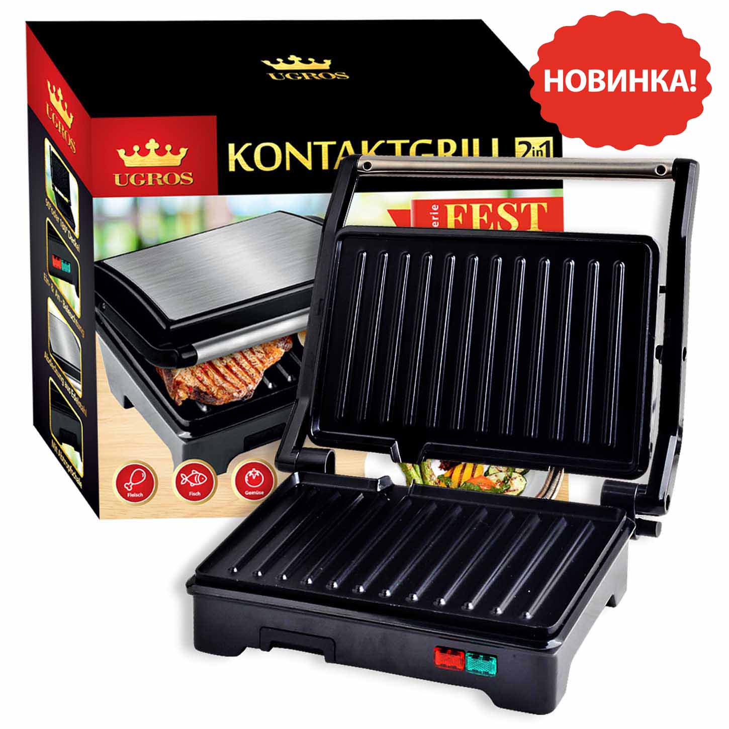 Elektrický kontaktný, tlakový gril "FEST" 2v1. S nepriľnavým povrchom varných plôch a indikátorom ohrevu. Má neohrievaciu rukoväť a nerezové veko. Na uľahčenie varenia je v spodnej časti grilu odnímateľná nádoba, do ktorej steká tuk alebo iné tekutiny cez vhodne umiestnené drážky na varných plochách. Nádoba sa ľahko čistí, rovnako ako samotné varné plochy. Gril je možné používať ako v zatvorenej, tak aj v otvorenej polohe o 180 stupňov. Gril je veľmi kompaktný a v kuchyni zaberá málo miesta. Je určený na prípravu mäsa, rýb, grilovanej zeleniny, toastov, horúcich sendvičov a iných pokrmov.