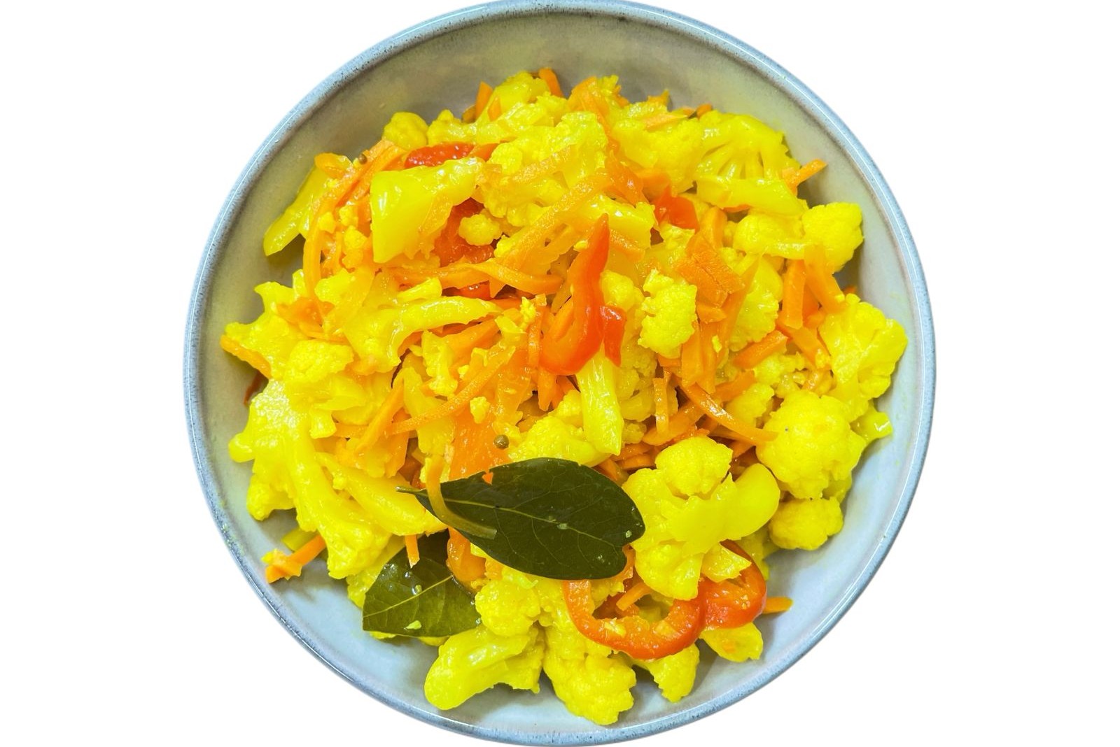 Zloženie: karfiol, mrkva, repkový olej, liehový ocot, zázvor, soľ, cukor, koriander, cesnak, červená chilli paprika, sladká paprika, čierne korenie, konzervačné látky: benzoát sodný, glutamát sodný.