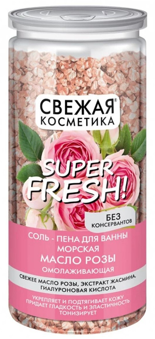 Omladzujúca penová kúpeľová soľ „Rose Oil“ „Fresh cosmetics“ obsahuje ružový olej, ktorý sa získava z čerstvých pukov damašskej ruže. Je známy pre svoje nutričné a antioxidačné vlastnosti.