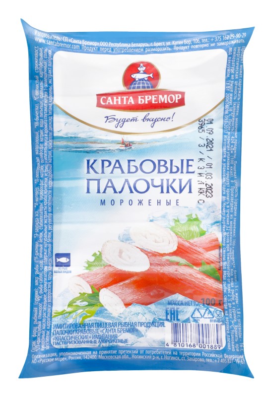 Složení: Mleté ryby surimi, zahušťovadla škroby: bramborový, pšeničný, bramborový modifikovaný, vaječný bílek, rafinovaný slunečnicový olej dezodarirovannoe, cukr, sůl, aromata kraba (zlepšující chuť ribonukleotid sodný, zahušťovadlo xantanová guma, konzervant sorban draselný, lecitin), sojový protein, směs multifunkční (zahušťovadlo alginát sodný, stabilizátory difosforečnan, polyfosfát), zagustitelkarraginan, barviva (jedlý přírodní: karmín, paprika extrakt, barevné cukr, antioxidant : Askorbylpalmitát, alfa-tokoferol), oxid titaničitý, voda.