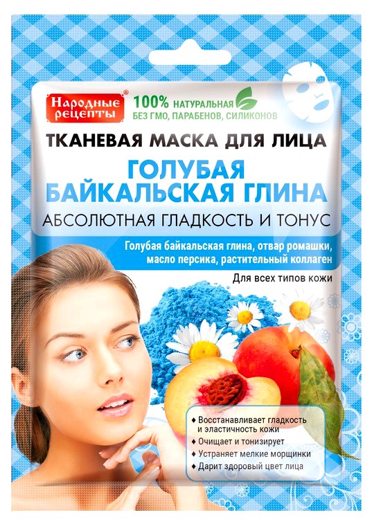 Moderní přírodní látková maska na bázi modrého bajkalského jílu s rostlinným kolagenem okamžitě obnovuje hladkost a pružnost pokožky, nasycuje ji vitamíny, dodává jí zdravý, svěží a pěstěný vzhled. Modrý jíl dokonale čistí a tonizuje pokožku, odvar z heřmánku hloubkově hydratuje, broskvový olej aktivně vyživuje a omlazuje, rostlinný kolagen eliminuje vrásky, zlepšuje pružnost pokožky.