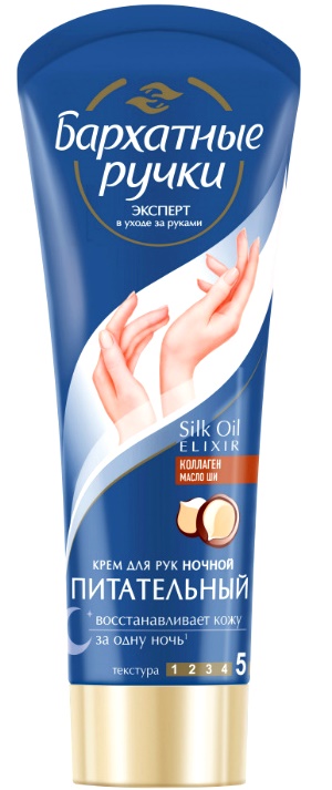 Speciální složení krému je určeno pro intenzivní regeneraci pokožky rukou v noci. Složky krému posilují proces obnovy kožních buněk, intenzivně vyživují a zjemňují pokožku rukou. Díky komplexu efektivně působících složek ráno se pokožka rukou stává pružnější a získává pocit pohodlí. Působení krému posiluje vzorec elixíru Silk oil. Mikrooleje obnovují kožní buňky a v kombinaci s hedvábnými proteiny jsou hebké a jemné.