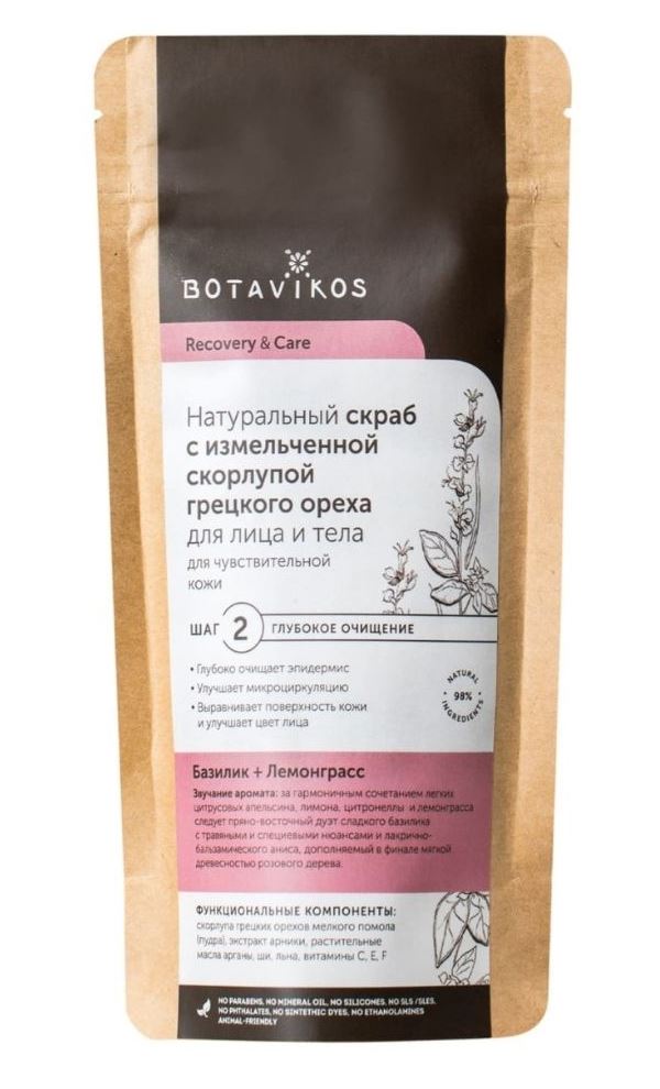 Přírodní peeling s drcenými skořápkami z ořechů na obličej a tělo. Pro citlivou pokožku. Funkční složky: jemně mleté ořechové skořápky (prášek), extrakt z arniky, rostlinné oleje z arganového, bambuckého, lněného, vitamíny C, E, F. Peeling hluboce čistí, zlepšuje mikrocirkulaci, vyrovnává povrch pokožky a zlepšuje pleť. Základem pro hloubkové čištění v drhnutí je drcené ořechové skořápky (prášek). Díky jemnému broušení abrazivní prvky nepoškozují pokožku, jemně odstraňují odumřelé buňky z jejího povrchu, vyrovnávají úlevu a stimulují proces obnovy buněk. Botanický extrakt z arniky, oleje a vitamíny jsou odpovědné za jemný přístup k charakteristikám citlivé pokožky.