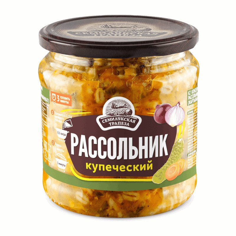 Rassolnik značky „Semilukskaja Trapeza“ je bezpochyby chutné a voňavé jedlo, ktoré je ideálne na výdatný rodinný obed. Pri jeho príprave sa vždy používajú iba kvalitné suroviny. Mrkva, kyslé uhorky a jačmenné krúpy v kombinácii s výberovými zemiakmi a cibuľou, dochutené zmesou aromatického korenia, robia z „Kupcovského rassolniku“ nielen chutné, ale aj výživné jedlo.