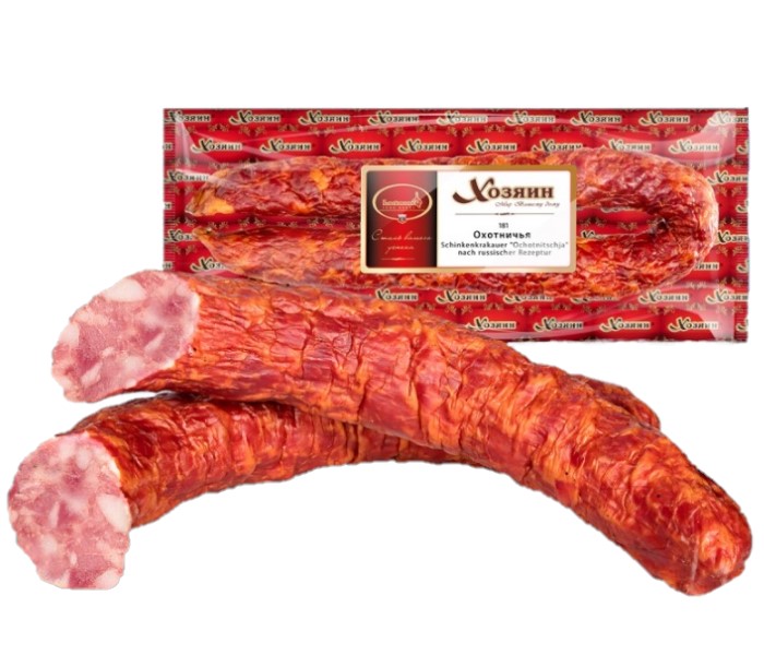 Složení: vepřové maso, hovězí maso, slanina, jedlá sůl, koření, látka zvýrazňující chuť a vůni: glutaman sodný, kořenicí extrakty, stabilizátor: difosfát, antioxidanty: kyselina askorbová, cukr, dextróza, kyselina: kyselina citronová, barvivo: karmíny, aroma, konzervant: dusitan sodný, vepřové střevo.