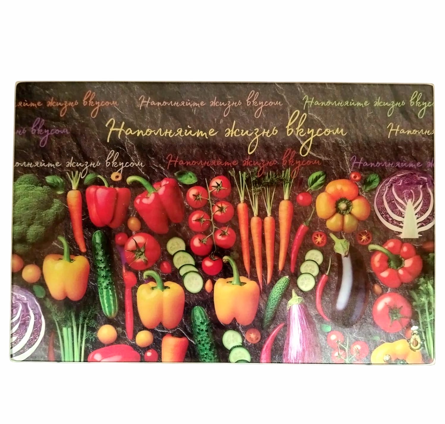 Táto štýlová sklenená doska je nielen praktickým pomocníkom v kuchyni, ale aj zdrojom inšpirácie. Elegantný dizajn s nápisom „Napolnyayte zhizn vkusom“ vytvára útulnú atmosféru a pripomína, aké dôležité je vychutnávať si každý moment.