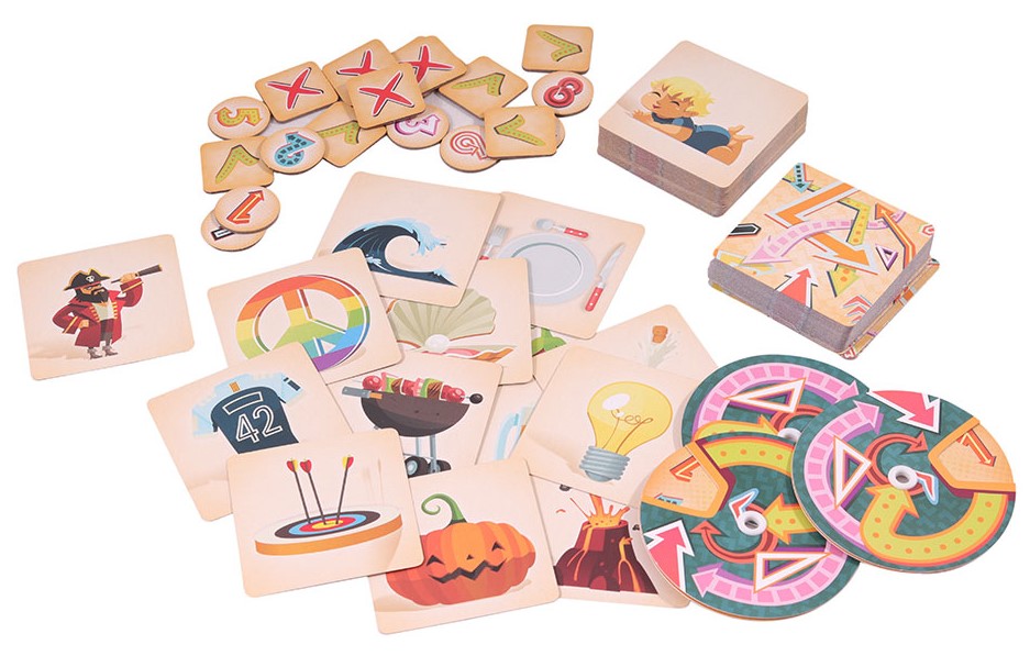 Herný set obsahuje: 300 kariet s obrázkami, 8 žetónov s číslami, 6 okrúhlych kariet na hlasovanie, 10 žetónov kola, Pravidlá hry.