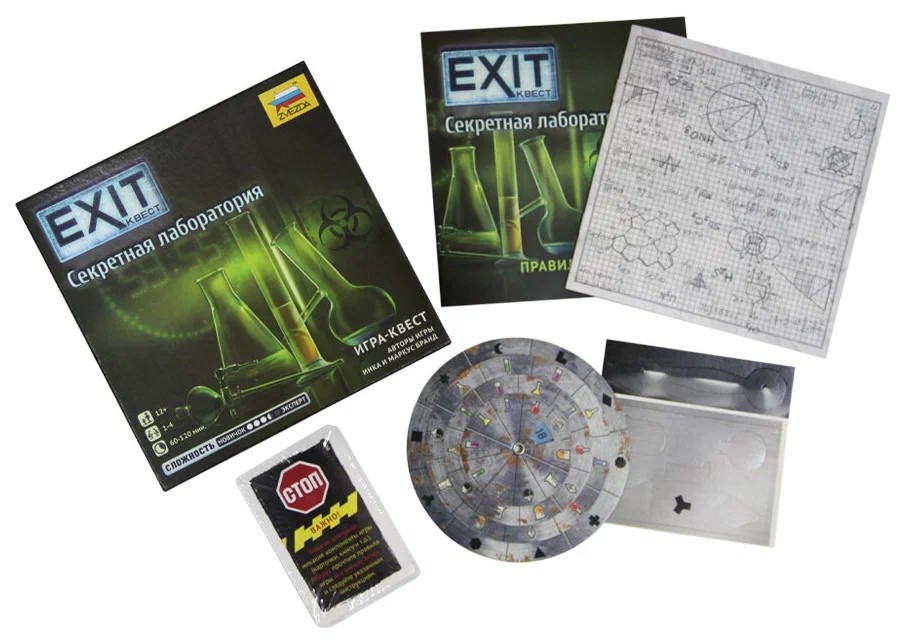 "Exit Kvest. Sekretnaja laboratorija" - stolová hra, ktorá vám umožní zažiť skutočný únikový zážitok priamo z pohodlia domova! Čaká vás množstvo tajomstiev a hlavolamov, ktoré budete musieť vyriešiť. Prejavte tímový duch, aby ste čo najrýchlejšie unikli z tejto strašnej pasce, inak sa stanete obeťou tohto desivého experimentu!