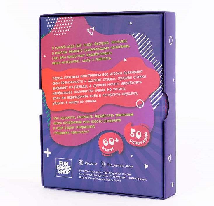 V naši igri vas čakajo hitre, zabavne in včasih malce norčave preizkušnje, kjer boste morali vključiti svoj intelekt, moč in spretnost. Kako mislite, da si boste prislužili spoštovanje svojih tekmecev ali pa le slišali zlobno "Dobro poskus!"? Na kratko o pravilih: Pred vsako preizkušnjo vsi igralci ocenijo svoje sposobnosti in stavijo. Najslabša stava izpade iz kroga, medtem ko lahko najboljša prinese največ točk. Vendar bodite previdni, če se precenite in ne uspete, boste končali z minus točkami.