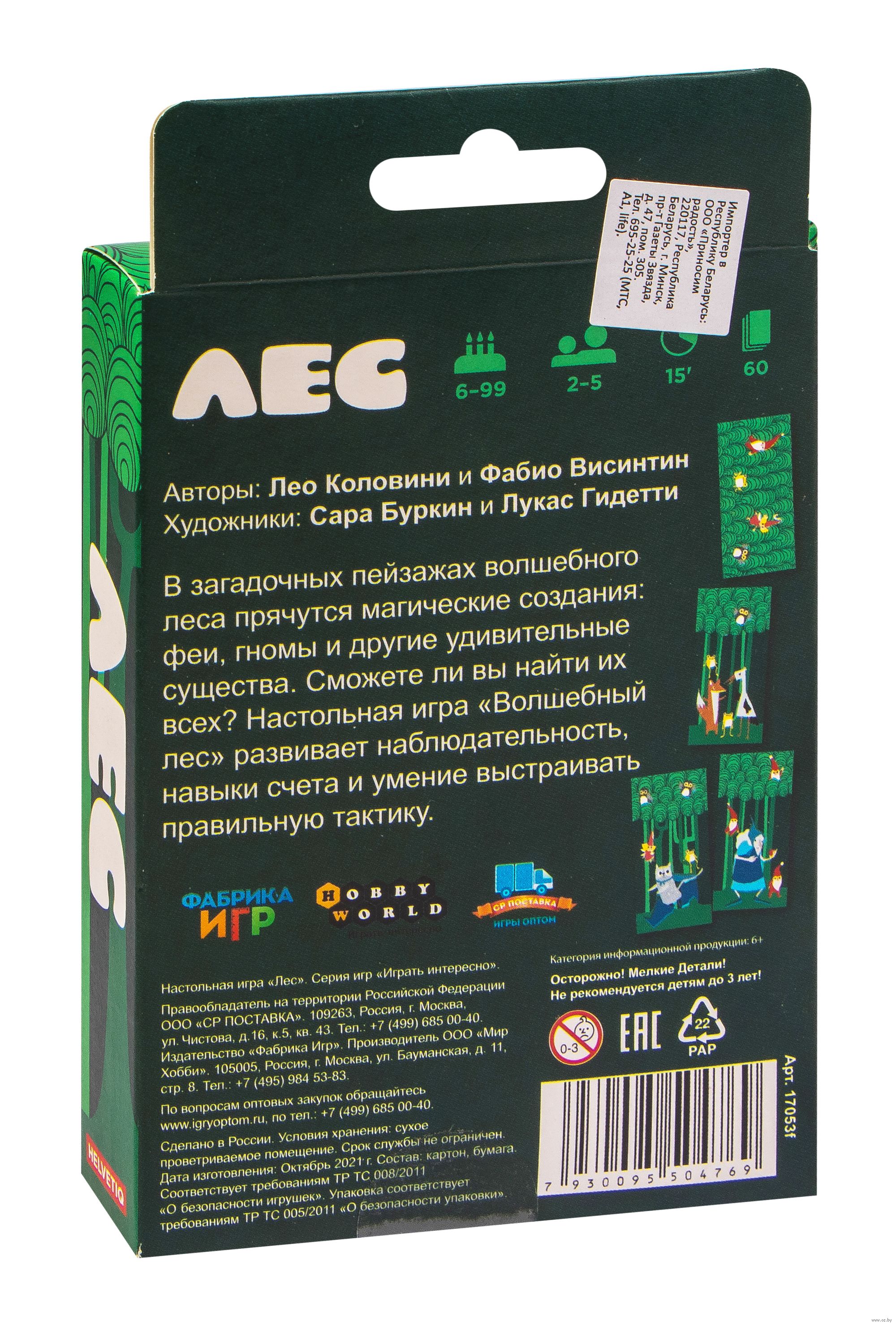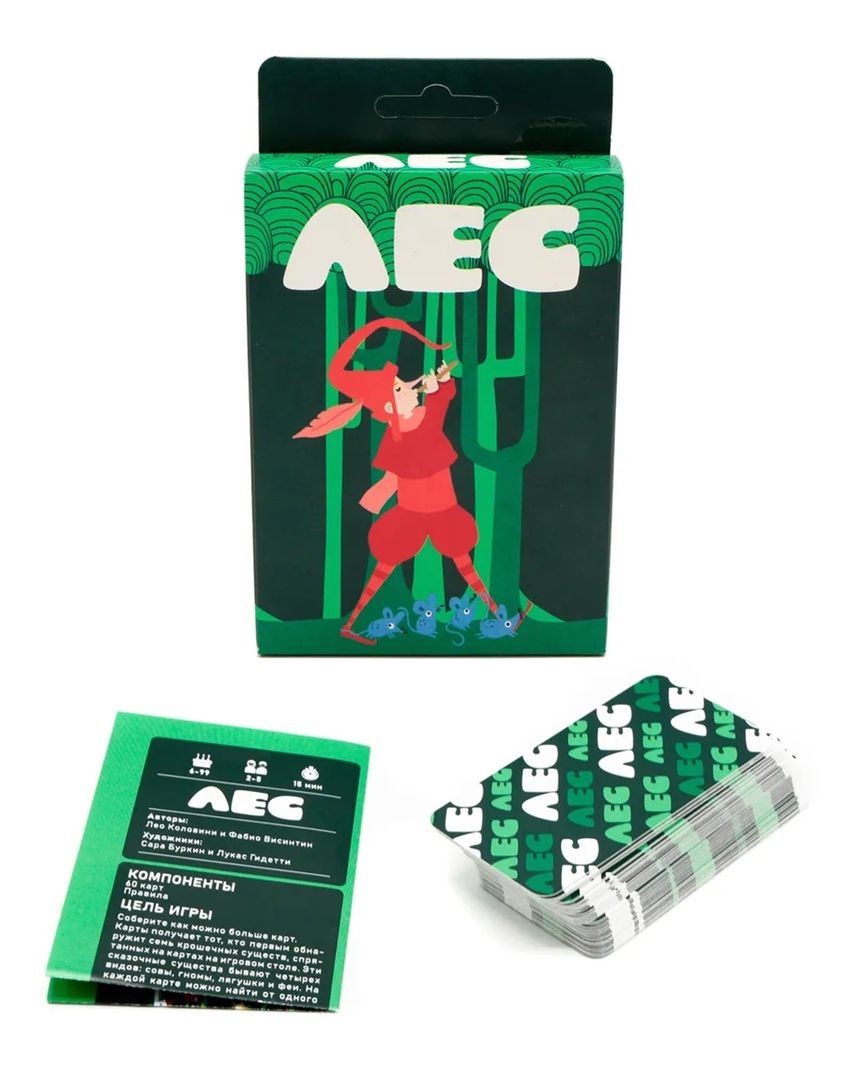 Stolová hra "Les" (od 6 let) je preprosta in hitra kartna namizna igra za otroke in njihove starše. Pomaga otrokom razvijati spretnosti štetja, opazovanja in sposobnost gradnje pravilne taktike. Karte v kompletu predstavljajo debla in krone dreves v čarobnem gozdu, na katerih so upodobljena različna bitja: vile, žabe, sove in palčki. Na vsaki karti lahko bitja prikažemo v poljubni sestavi in v poljubnem številu. Na začetku igre vsak igralec dobi 3 karte, preostale tvorijo skupen kup. Prvi igralec položi katero koli svojo karto, s tem začne gozd. Nato vzame karto iz skupnega kupčka, da ima spet 3 karte v roki. Nato se poteza prenese na naslednjega igralca v smeri urinega kazalca. Morate pazljivo spremljati hitro rastoči gozd, saj takoj, ko se v njem pojavi 7 (ali več) bitij iste vrste, morate prvi povedati, o katerih bitjih gre! Igralec, ki prvi izpolni to pogoj, si vzame vse karte s temi bitji iz gozda - te postavijo pred igralca in tvorijo njegove zmagovalne točke. Igra traja, dokler se karte ne izčrpajo v skupnem kupčku in na rokah igralcev. Najbolj pozoren in hiter igralec, ki zbere največ kart, postane zmagovalec.