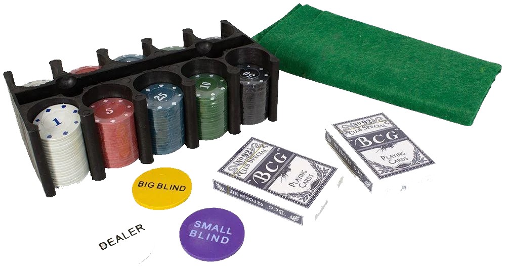 Vsebina kompleta: 200 žetonov v vrednosti 1, 5, 10, 25 in 50 enot, žetoni blindov in delilca, 2 kompleta po 54 kart, organizator za žetone, blago