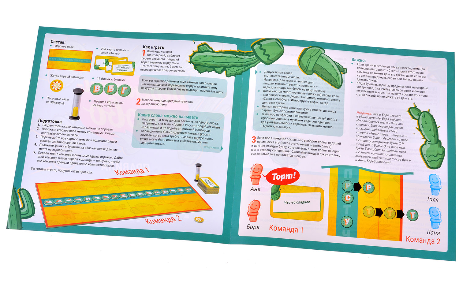 Vsebina: Igralno polje, 17 žetonov, 208 kart, žeton prve ekipe, ure, pravila igre