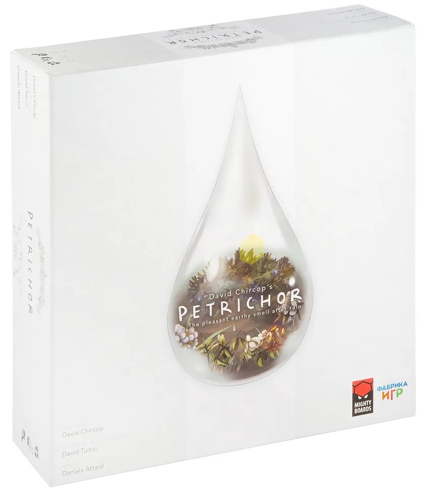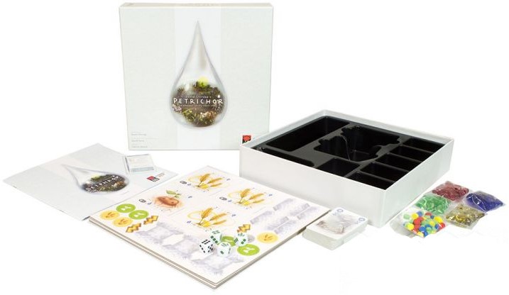 Zloženie: 3 kocky úrody, obyčajná kocka, 4 hráčske pomôcky, 16 žetónov rastu, 12 žetónov pšenice, 12 kartónových mrakov, 12 žetónov búrky, 9 kariet pre sólovú hru, ukazovateľ prvého hráča, ukazovateľ kola, 4 žetóny +0 16 polí, 40 kariet počasia, 80 sklenených kvapiek, 56 drevených diskov, hracia doska, pravidlá hry.