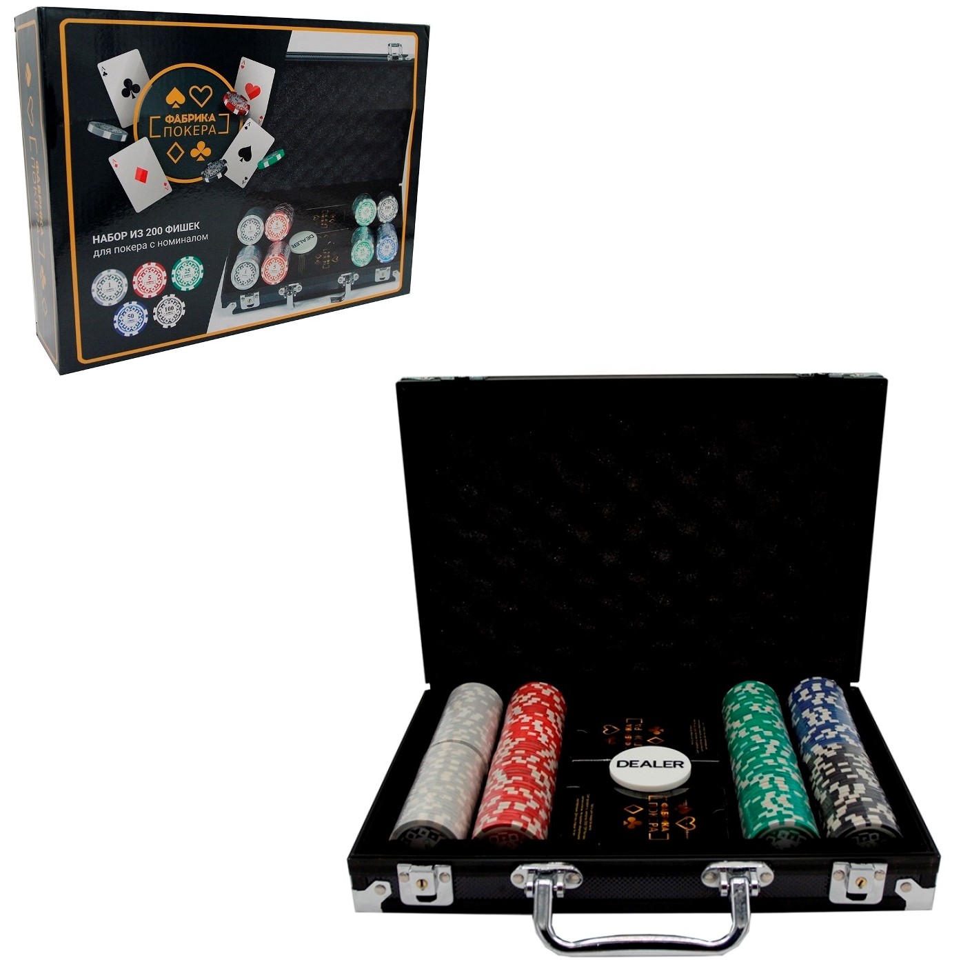 Toto je kufrík so sadou pre hru pokru v malej spoločnosti. Tento kufrík je pohodlné vziať so sebou – na večierok, na chalupu, na piknik, na návštevu. Uzatvára sa na kľúč, takže sa žiadna žetón z hry nestratí na ceste. Štýlové karty a žetóny a impozantne vyzerajúci kufrík dodávajú hre zvláštnu atmosféru.
