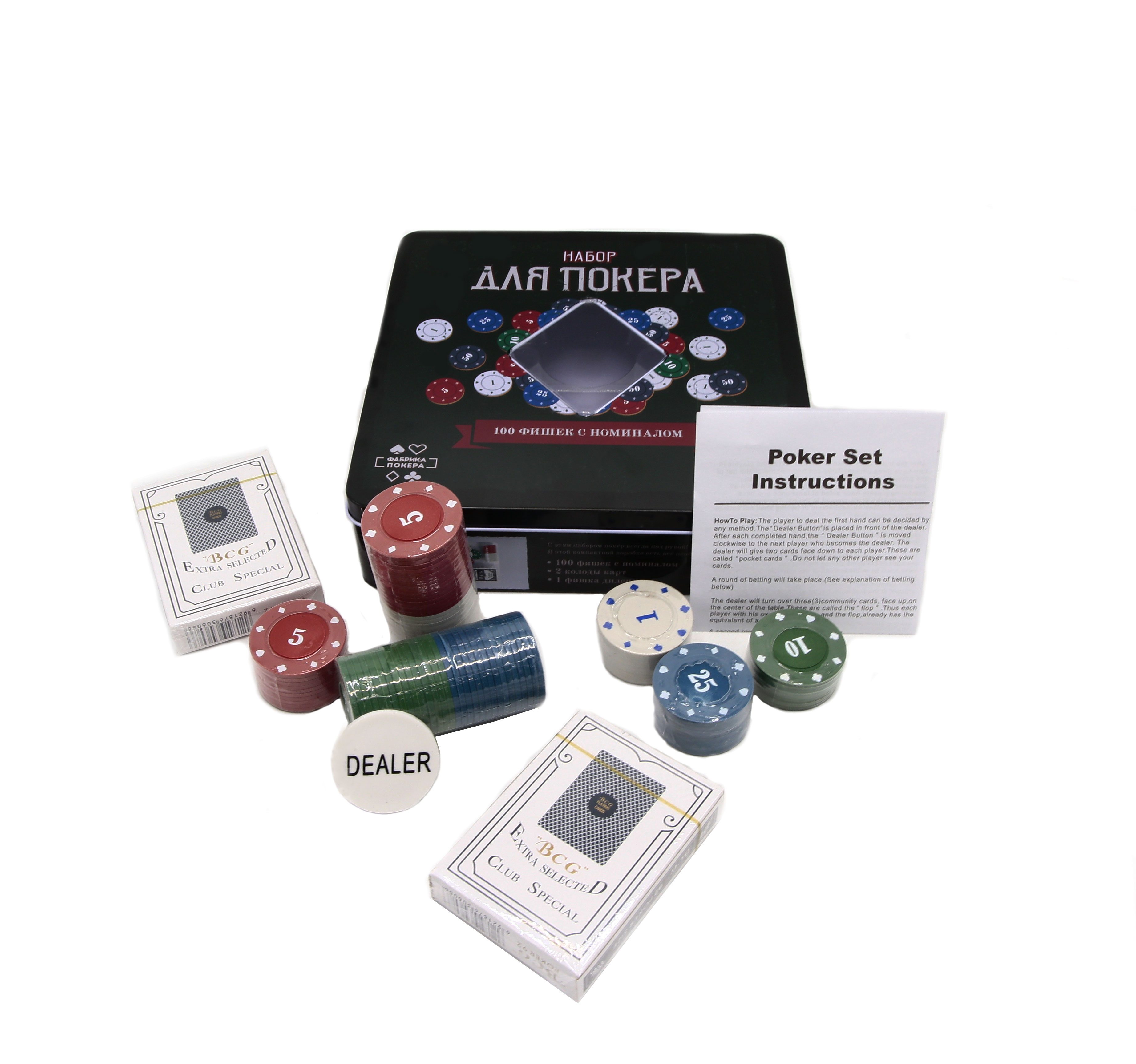 Vsebina škatle: 100 žetonov v vrednosti 1, 5, 10 in 25 enot, žeton delilca, 2 špila s po 54 kartami