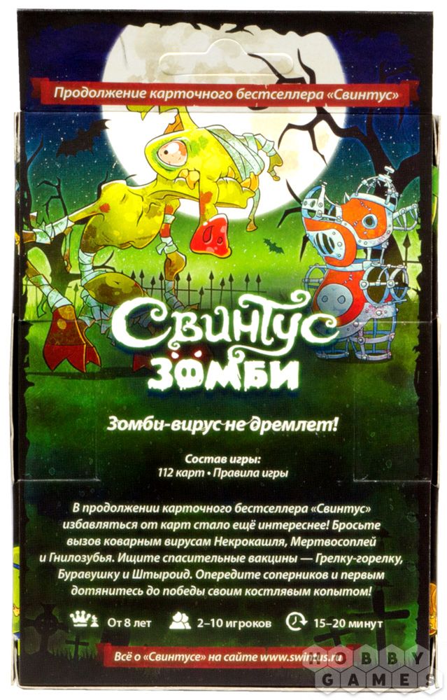Stolová hra "Svintus. Zombi" (od 13 let) je nova igra v megapopularni seriji karetnih iger "Svintus" za tiste, ki se trudijo preživeti v pisarni. Zdaj je še težje se znebiti vseh kart v roki - in še bolj zanimivo! Okužite tekmece z virusi zombijev, poiščite reševalne cepiva in postanite prvi, ki doseže zmago s svojim kostnim kopitom!