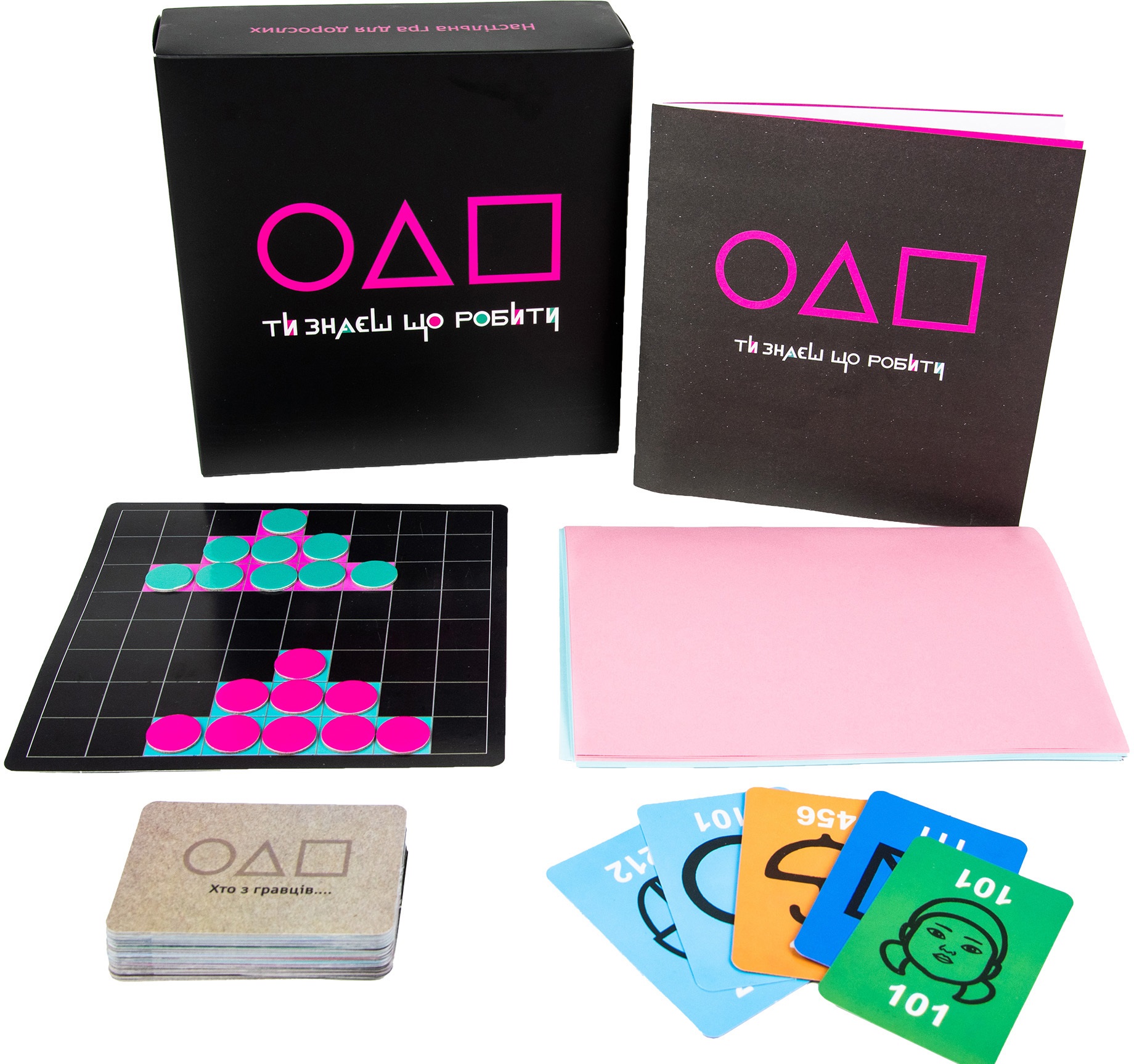 Stolová hra "Ty znaeš ščo robyty" (18+ ukraj) - niz iger, navdihnjenih s serijo "Igra v kalamara". Ustvarili smo to igro, da jo lahko igrate tako v veliki skupini kot v dvoje.