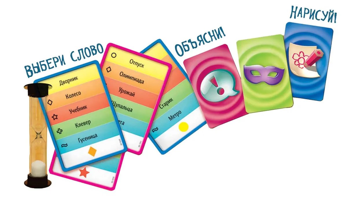 Vsebina: 147 dvostranskih kart z nalogami; 27 kart z dejanji; peščena ura; pravila igre.