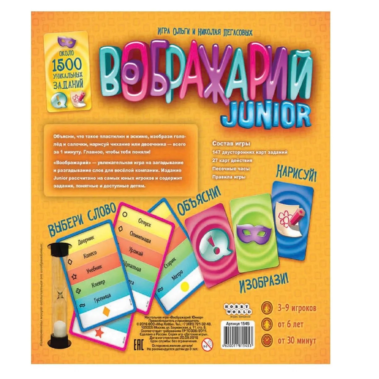 Stolová hra "Voobražarij. Junior" (od 6 let) je nov predstavnik odlične serije namiznih iger, zgrajenih na asociacijah. Tokrat je bila igra posebej razvita za otroke od šestih let naprej. To se odraža v prilagojenih pravilih, oblikovanju in seveda bolj primernem naboru besed na karticah. Ne bojte se, da bodo besede preveč preproste - igra ponuja dve stopnji težavnosti, kjer boste med enostavnimi nalogami naleteli na besede kot so "risani film", "vrtec" ali "mikrob", medtem ko boste med težjimi nalogami naleteli na besede kot so "ponos" ali "blokada".