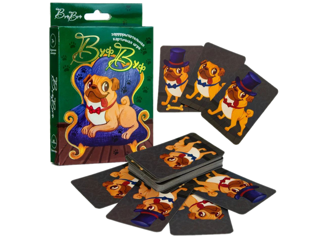 Stolová hra "Vuf-Vuf" (od 7 let) je zabavna kartična igra na hitrost in pozornost za otroke in odrasle. V tej igri je treba najti na kartah mopse s skupnimi znaki in jih pridobiti zase.